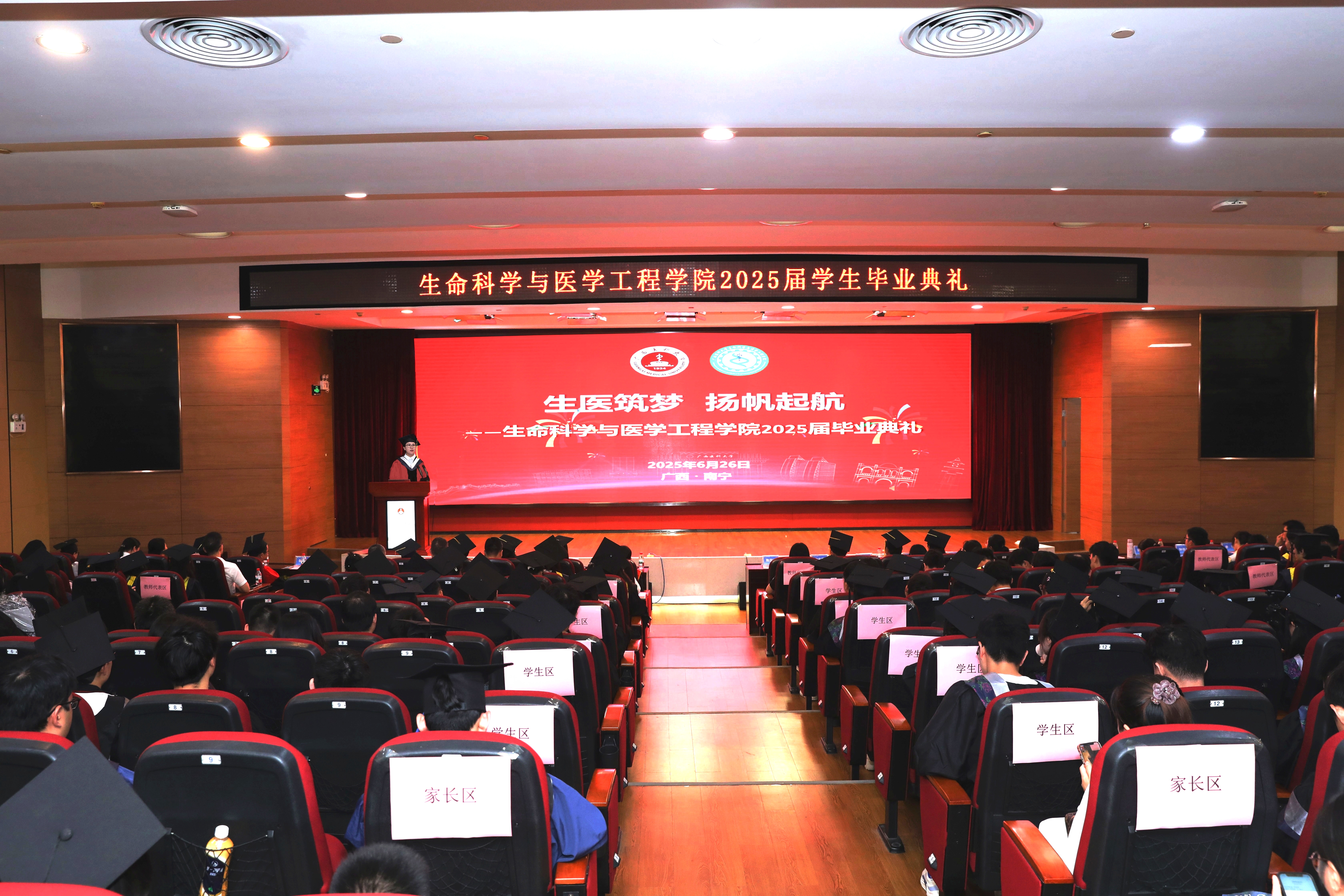 盛夏时节,凤凰花绚丽绽放,风帆高扬,生医学子们蓄势待发,即将踏上远航之路。6月26日,生命科学与医学工程学院2025届毕业典礼在科技楼2楼报告厅隆重举行。生科院党委书记陈国湘、院长梁浩及全体院领导出席典礼。全体辅导员、班主任、教师代表、家长代表、2025届全体毕业生齐聚一堂,共同见证这一重要时刻。陈国湘担任此次典礼的主持人。