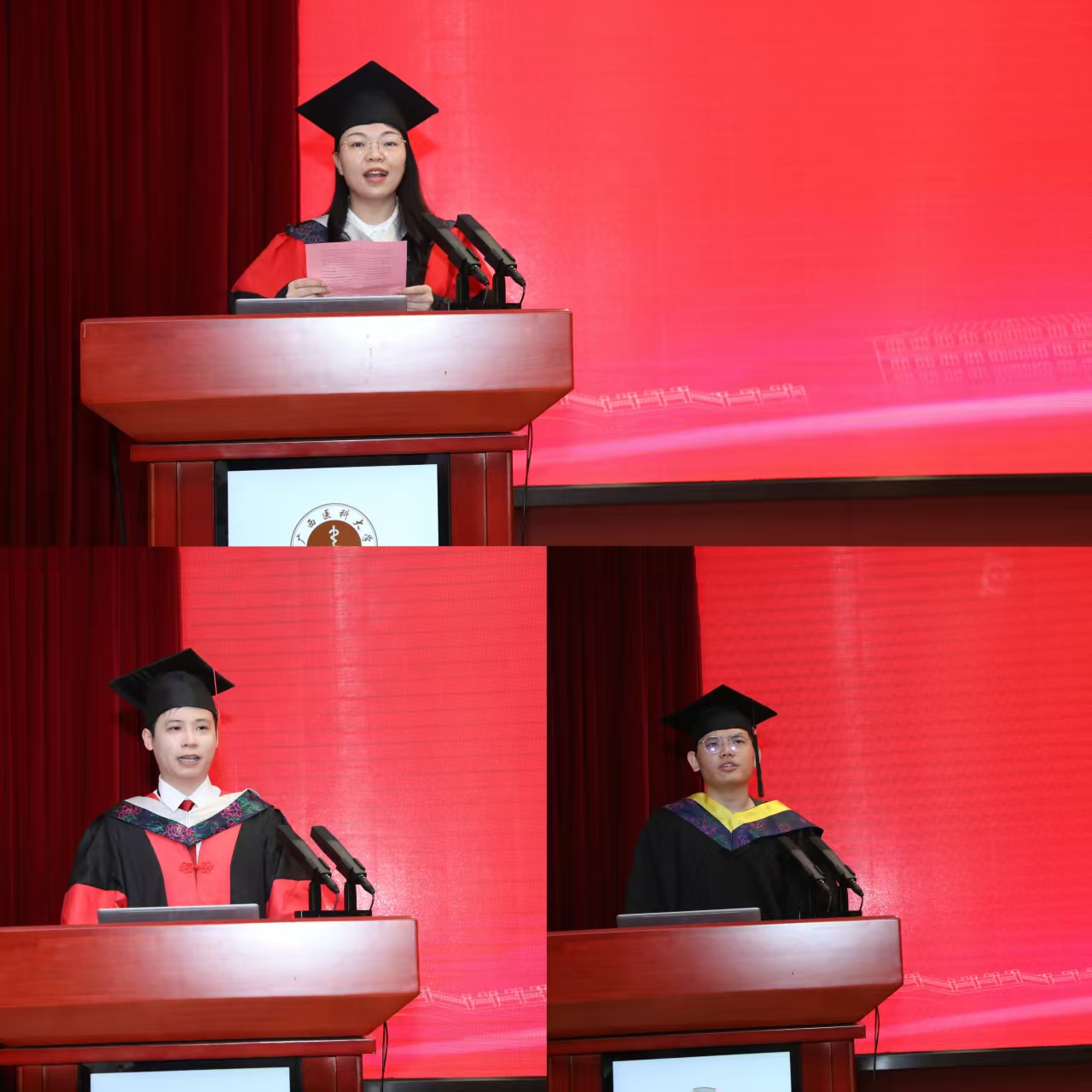 教师代表钟静萍向全体毕业生送上祝福与期望,她希望毕业生们在未来的学习、工作与生活中,以无畏的勇气直面未知挑战,勇攀生命科学与医学工程领域的高峰,用智慧与汗水创造属于自己的精彩未来。2025届毕业本科生代表闫畅、研究生代表黄汉记也先后发言,他们回顾了在校期间的学习成长点滴,对母校、学院的眷恋与感恩溢于言表,并代表全体毕业生郑重承诺,定会牢记母校嘱托,在祖国最需要的地方绽放青春光彩,书写人生华章。