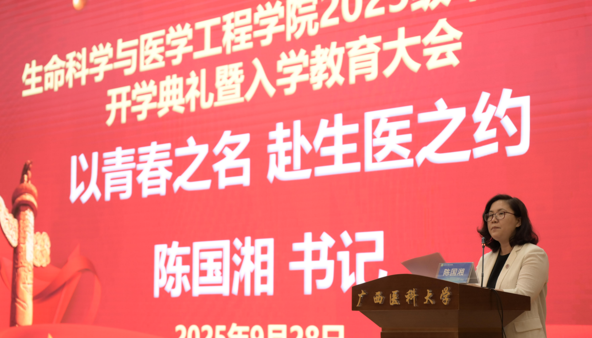 会上,陈国湘以《以青春之名,赴生医之约》为题,向新生们致以诚挚欢迎。她殷切期望同学们:一是志存高远、胸怀家国,把个人奋斗融入民族复兴时代洪流;二是勤奋刻苦、自律自强,以扎实学识筑牢创新根基;三是互相包容、共同成长,在集体学习生活中开放胸怀与健全人格。她勉励同学们,要珍惜时代机遇,知行合一,成为肩负民族复兴重任的时代栋梁,不负青春韶华。