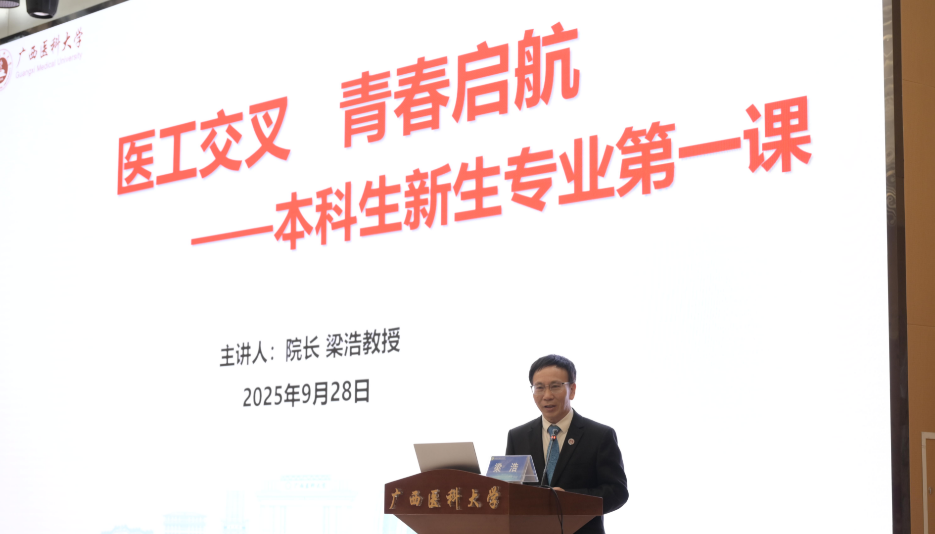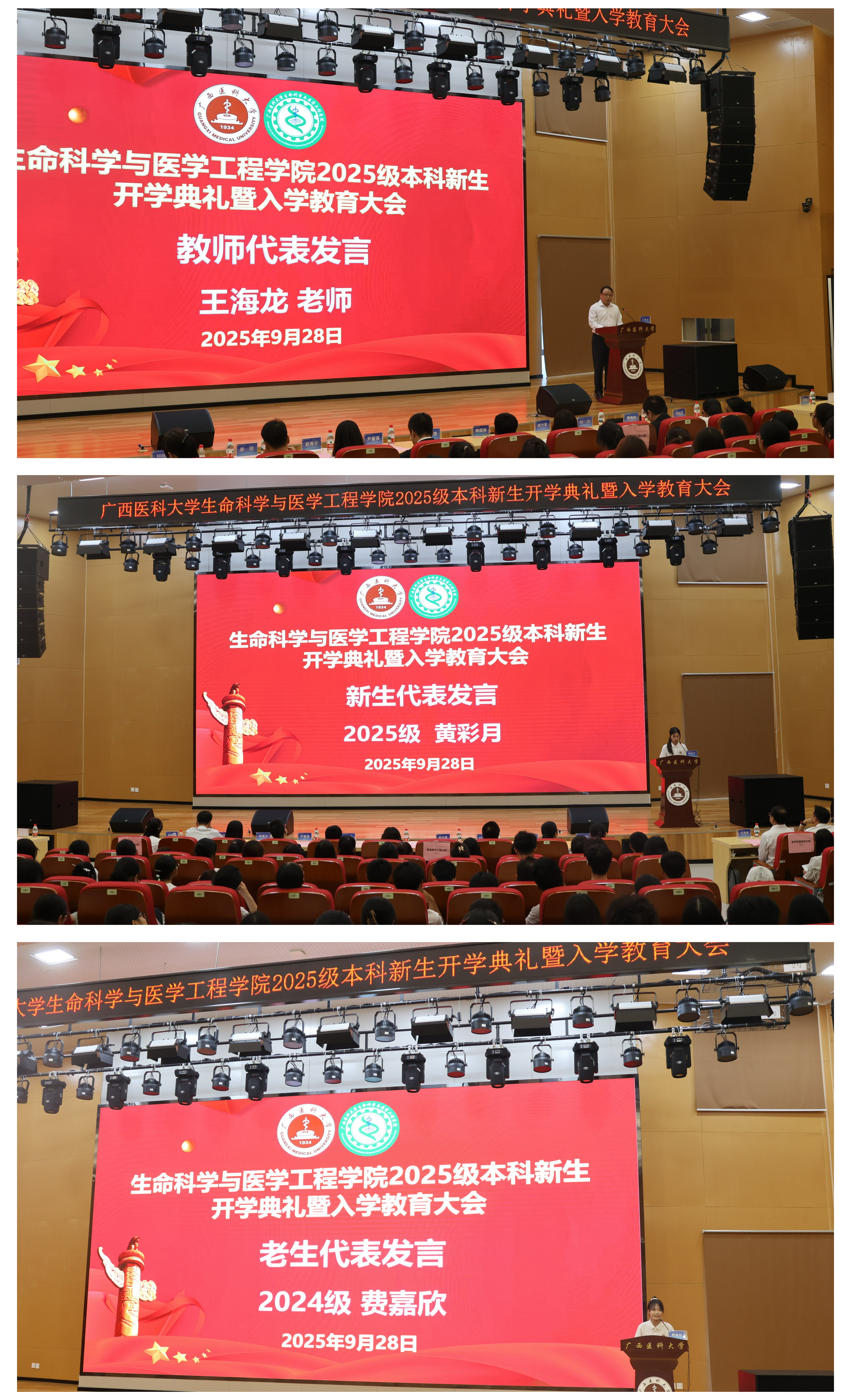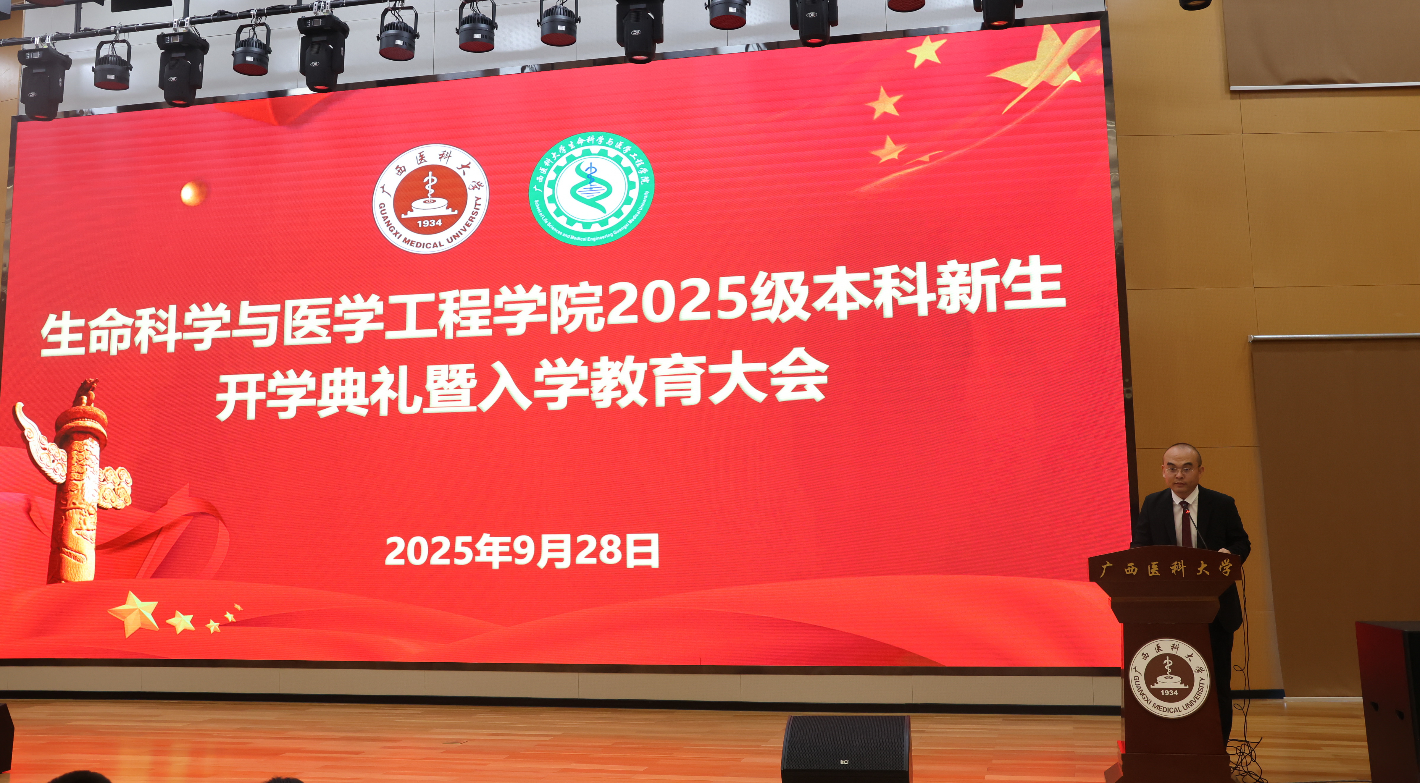 9月28日,生命科学与医学工程学院在武鸣校区图书馆鼎新厅报告厅举行2025级本科新生开学典礼暨入学教育大会。学院党委书记陈国湘、院长梁浩等院领导,学工办、教研科、各教研室负责人、新生班主任以及199名新生参加大会,会议由学院党委副书记宋方茗主持。