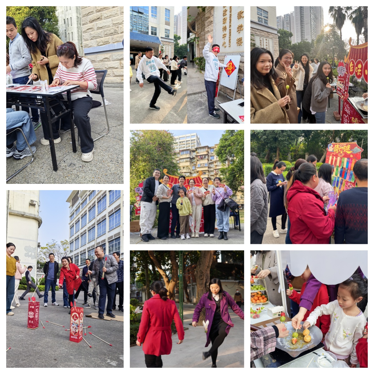 游园活动内容丰富生动,共设有糖葫芦制作、手工贺卡、新年许愿树、元宵铺子、蒙眼摸福、踢毽子、投壶、趣味抛圈、猜灯谜等项目,形式多种多样、妙趣横生。教职工及家属们积极参与,其乐融融。