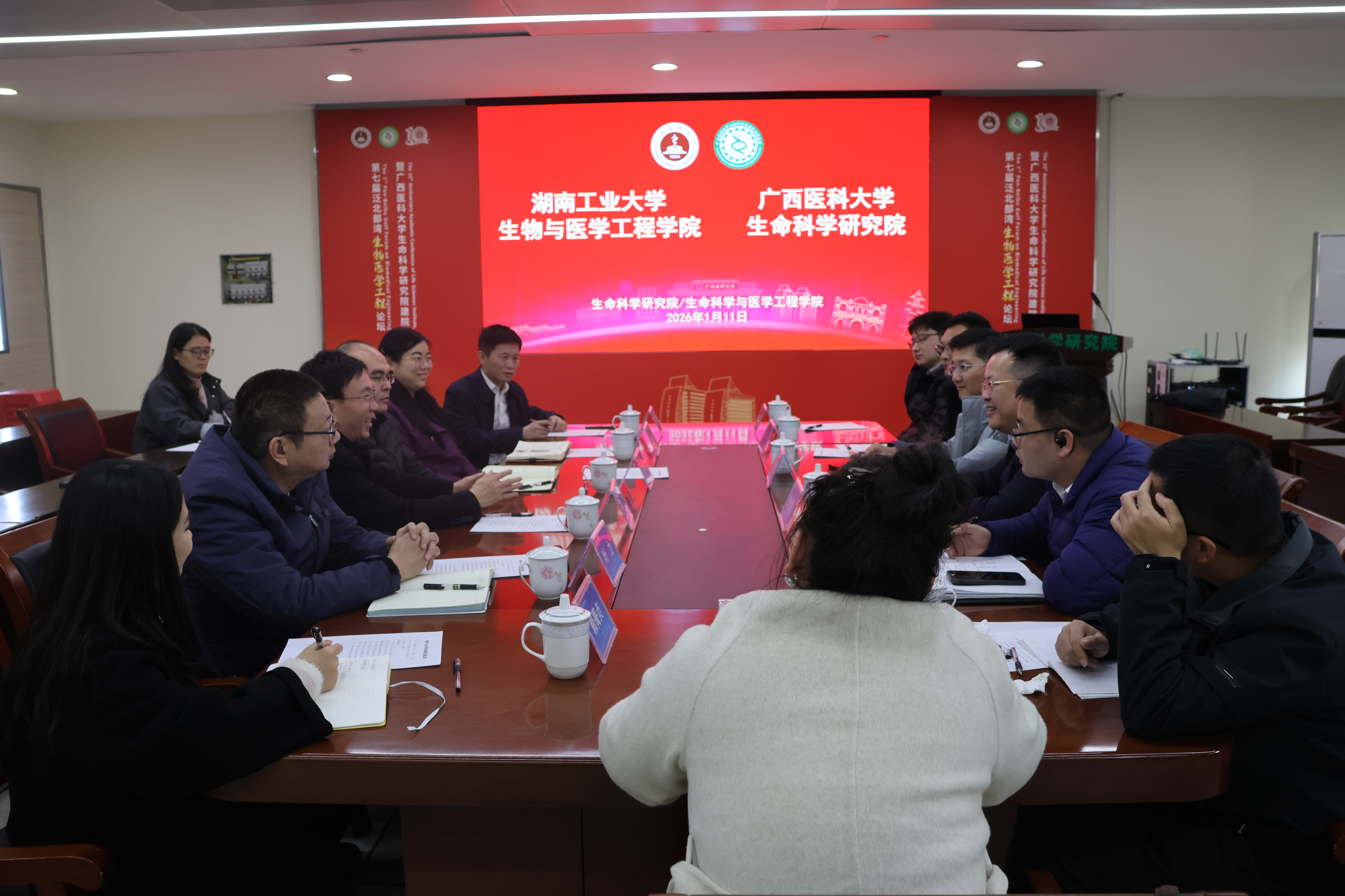 在第七届泛北部湾生物医学工程论坛暨广西医科大学生命科学研究院建院十周年学术会议举办期间,湖南工业大学生物与医学工程学院院长贺全国教授一行应邀莅临学院参会。双方均于2024年获批生物医学工程一级学科博士点,为进一步深化学科建设经验交流,1月11日,双方在科技楼0501学术报告厅开展专题座谈。生命科学研究院、生命科学与医学工程学院院长梁浩、副书记宋方茗、副院长叶力及部分教师代表出席。座谈会由梁浩主持。